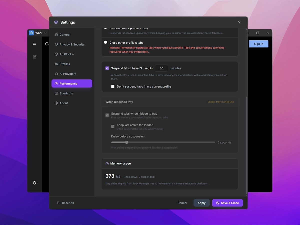 | Performance | Tab loading strategy, auto-suspend timeout, profile switch behavior |