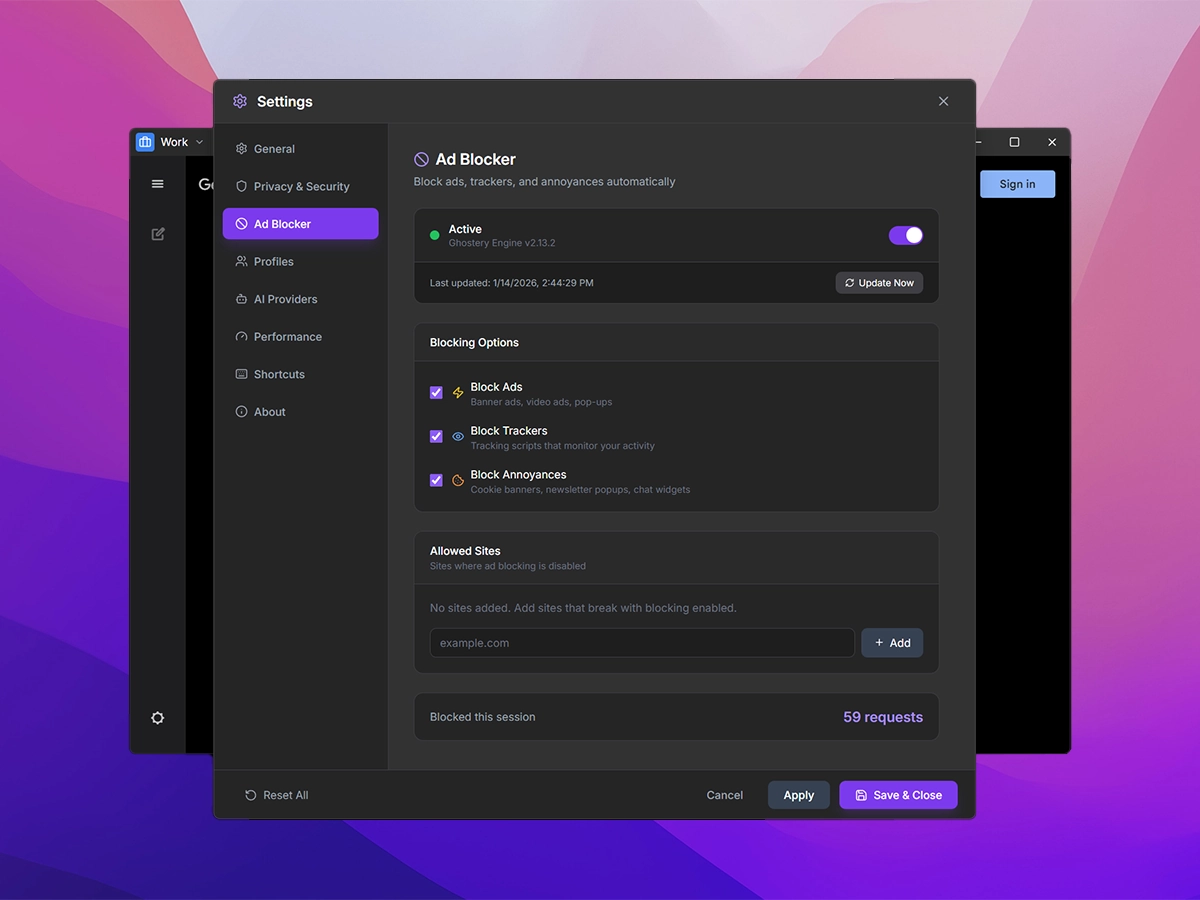 Work without distractions - Ad blocking built-in. Privacy-first. Your AI conversations stay on your computer, not sold to advertisers.
