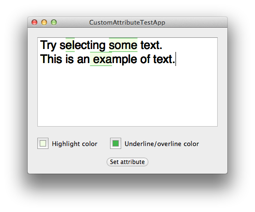 In this application we create a custom NSTextView and NSLayoutManager that draws a new type of attribute with background highlighting and under- and overlining.