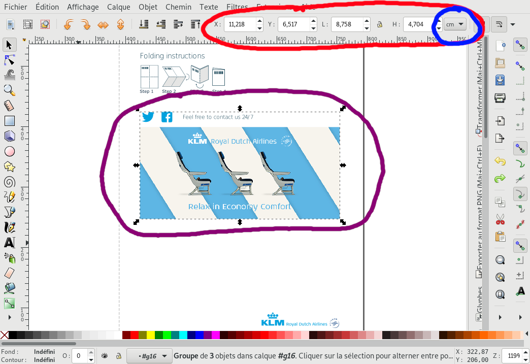 Instructions: After opening your pdf file, start by selecting the ad (purple), you may have to ungroup elements (ctrl+shift+g), then set the dimensions in cm or your favourite length unit (blue) and finally note the dimensions of the ad (red).