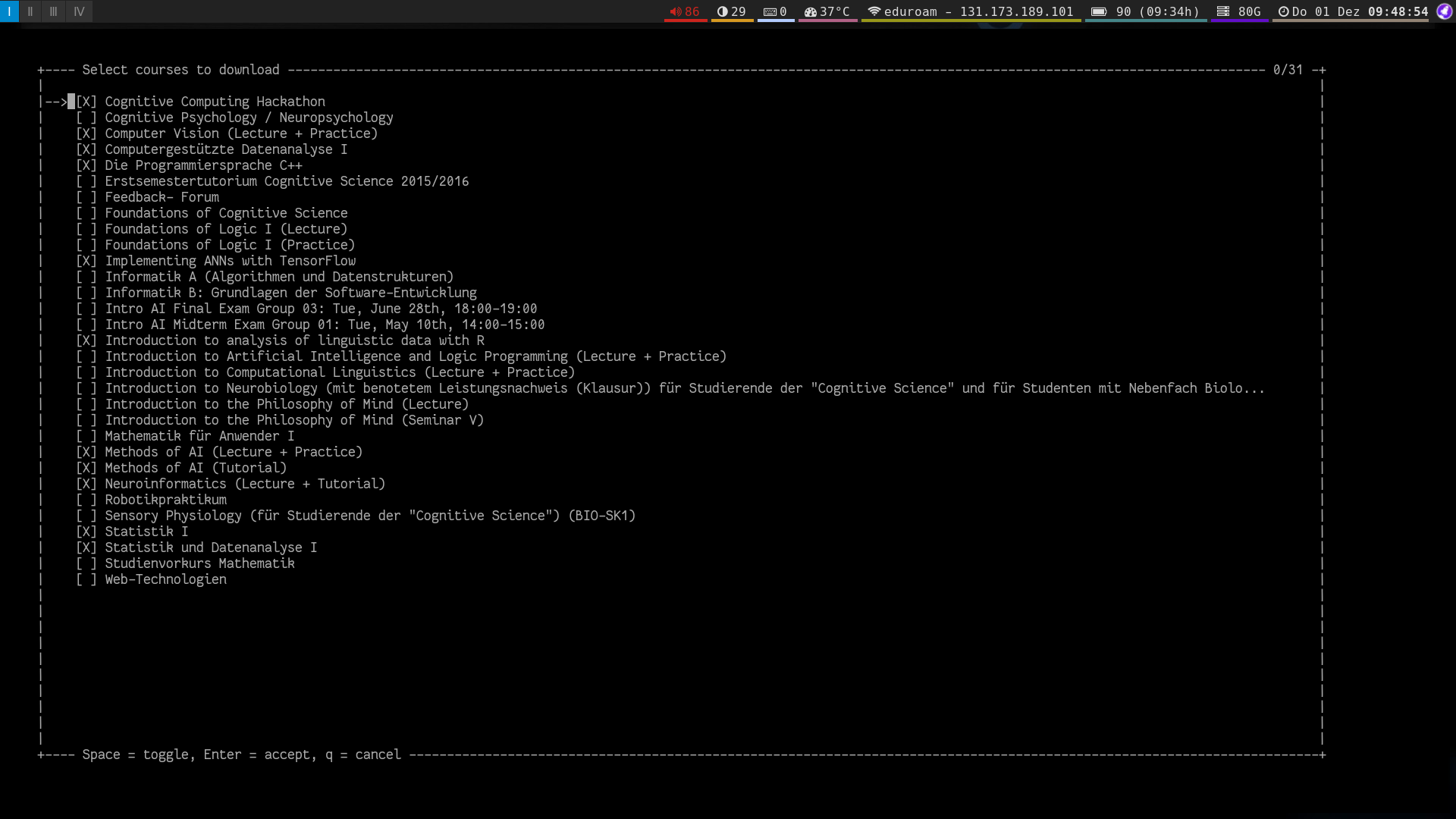 By default studdp will download all courses you are subscribed to to the folder defined in base_path. You can limit this selection using studdp -c which will bring up a ncurses interface to configure your course selection.