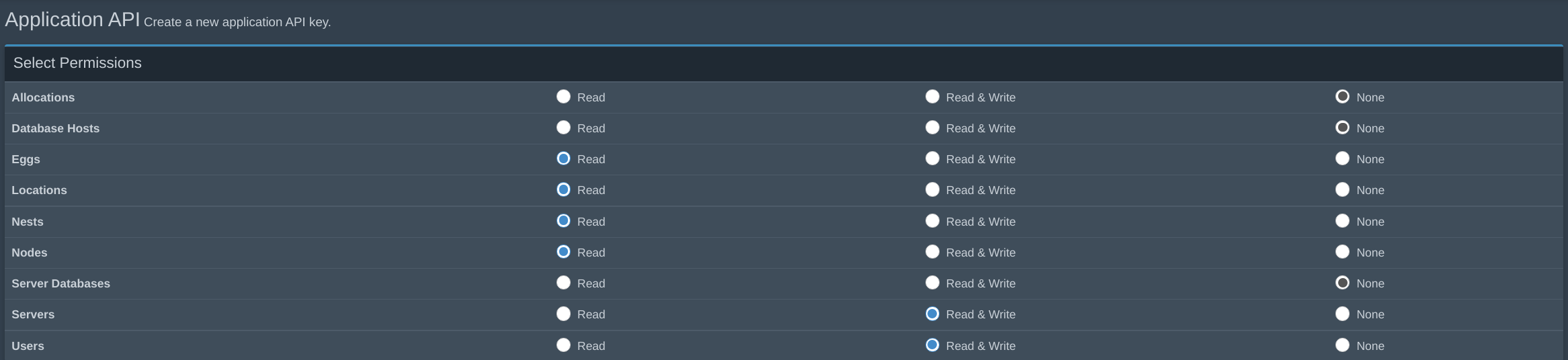 pterodactyl/folder into<path to whmcs>/modules/servers/. - Create API Credentials with these permissions: