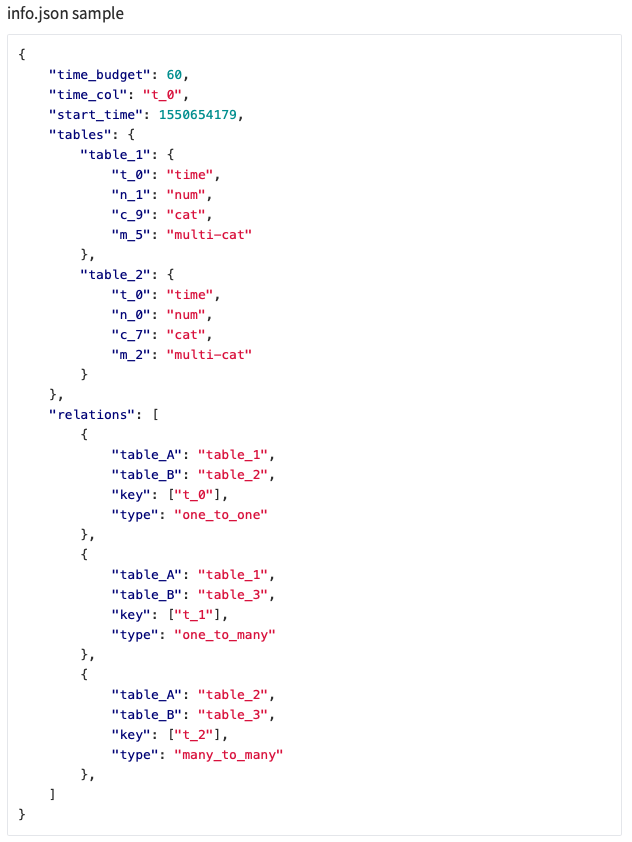 • relations: a list that stores table relations in the dataset. Each relation can be represented as an ordered table pair (table_A, table_B), a key column key that appears in both tables and acts as the pivot of table joining, and a relation type type. Different relation types will be introduced shortly.