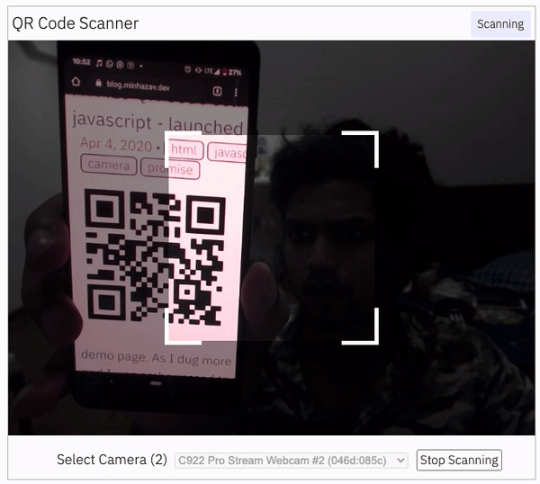 - HTML5 QR Code scanning with JavaScript — Support for scanning the local file and using default camera added (v1.0.5)