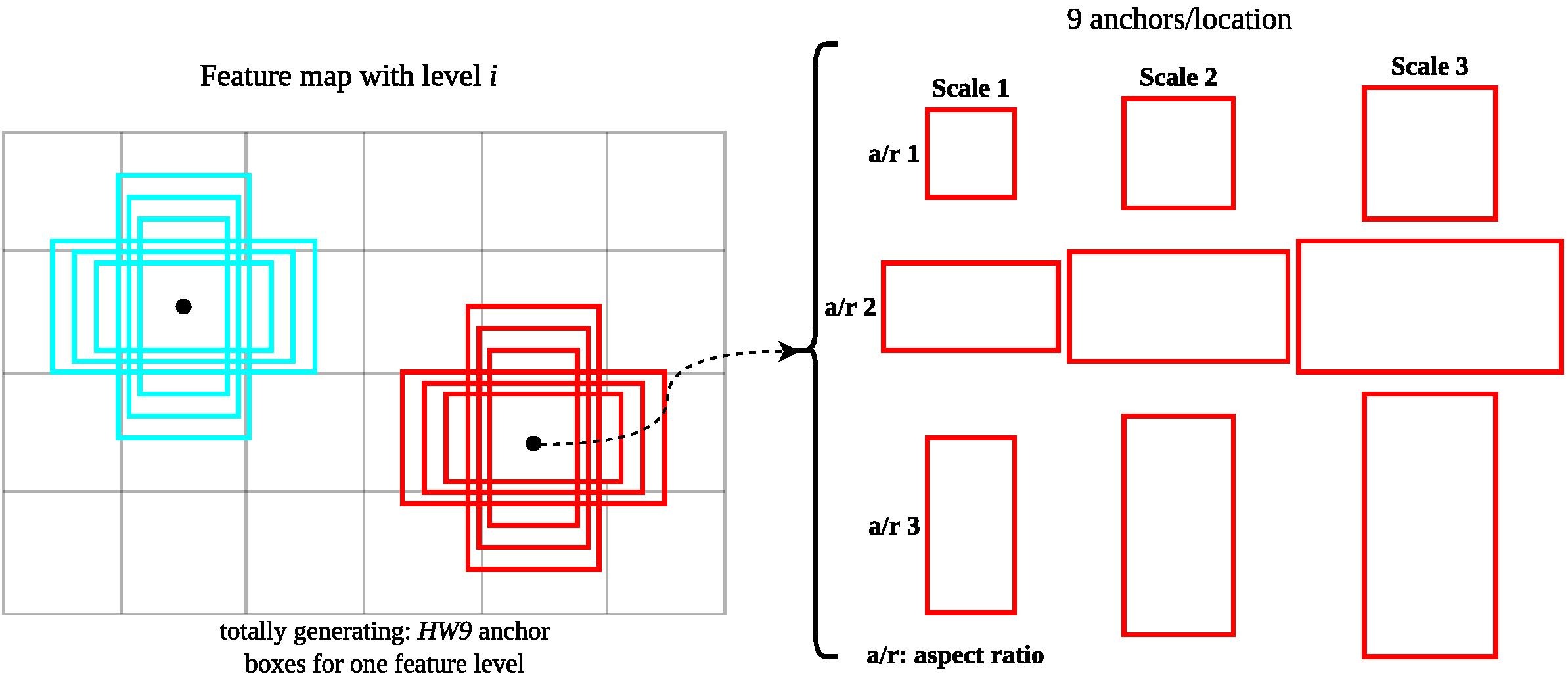 ${4\times 2^0, 4\times 2^{1/3}, 4\times 2^{2/3}}$ of the original set of 3 aspect ratio anchors. In total there are$A=9$ anchors per level. For a feature map at level$i$ , these anchor's look as follows (image credit: A review on anchor assignment and sampling heuristics in deep learning-based object detection).Complete the