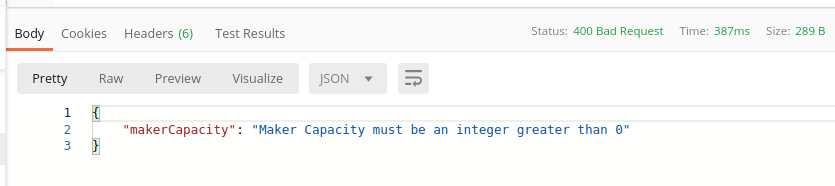 - In case of wrong input (we'll discuss the allowed inputs very soon) you'll get an error message in the POSTMAN. Example:
