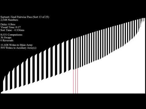 Works very similarly to Grailsort; fairly straightforward and overall efficient design. Notice the somewhat odd recursion at the beginning of each run which sorts the first O(sqrt n) items -- the external buffer area -- in the array. Has the same significant bottleneck that Grailsort does: the scrolling buffer having to move back to the beginning of the array for every merge during the latter half of sorting, which I tend to call "buffer resets".