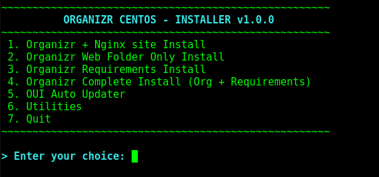 sudo yum install gitsudo git clone https://github.com/elmerfdz/OrganizrInstaller /opt/OrganizrInstallercd /opt/OrganizrInstaller/centos/ocisudo bash oc_installer.sh