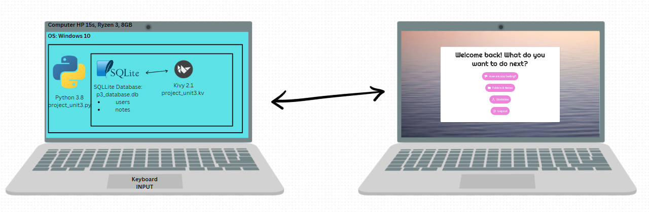Fig.1 is the System Diagram. It shows the brand and type of the computer, with its specifications and the Operative System is has. The program runs in Python 3.8 and uses different codes (project_unit3.py, project_untit3.kv). Then, these codes connect with a database of sql files (p3_database.db).