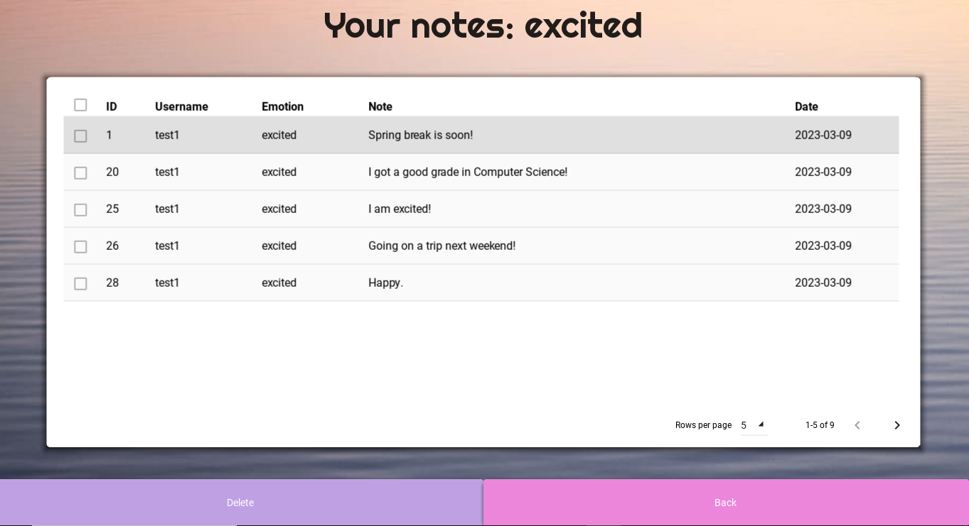 The AllNotes class defines several methods for interacting with the notes database. The update() method gets all notes from the database with the selected emotion and displays them in a MDDataTable widget. The delete() method deletes all notes that were checked by the user using the MDDataTable checkbox. The cancel() method returns to the previous screen. The on_pre_enter() method is called before the screen is shown and creates the MDDataTable widget.