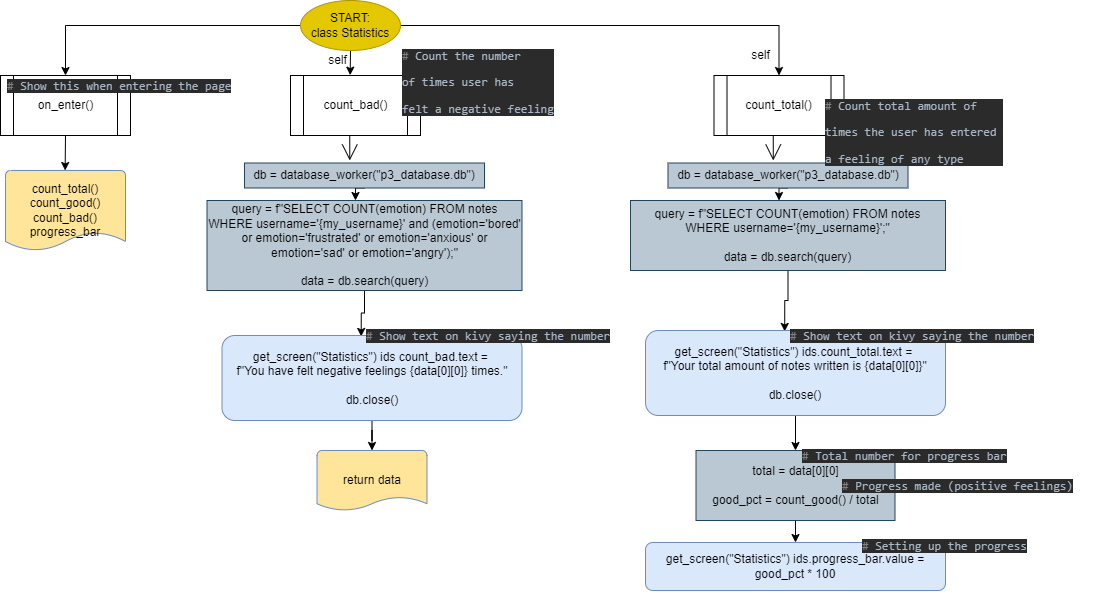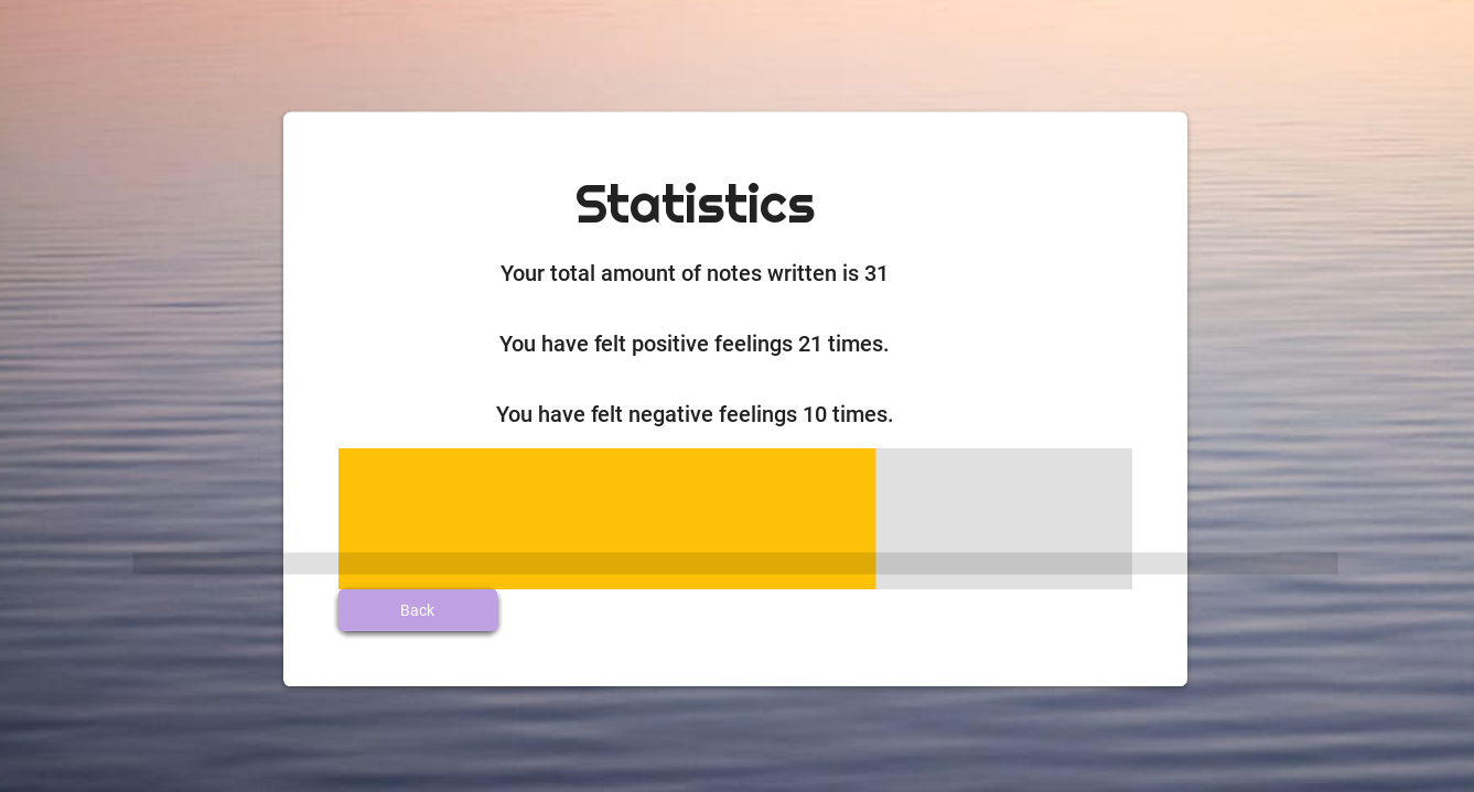 md_bg_color: "#bfa1e3"The screen "Statistics" displays basic data about the user's well-being. There are three labels that display the number of times the user has felt negative feelings, positive feelings, and the total amount of notes written. These labels are updated by calling the count_bad(), count_good(), and count_total() methods, respectively. These are methods on Python. The count_bad() counts the number of times the user has felt a negative feeling by querying a SQLite database and displaying the result on a Kivy Label with the id count_bad. The count_good() counts the number of times the user has felt a positive feeling by querying a SQLite database and displaying the result on a Kivy Label with the id count_good. The count_total() counts the total amount of times the user has entered a feeling of any type by querying a SQLite database and displaying the result on a Kivy Label with the id count_total. Additionally, it sets up a progress bar widget by calculating the percentage of positive feelings in relation to the total amount of notes and updating the value of a Kivy ProgressBar with the id progress_bar. The on_enter() method is called when the Statistics screen is entered. It calls the count_total(), count_good(), and count_bad() methods and creates and adds a MDProgressBar widget to the screen with the id progress_bar.