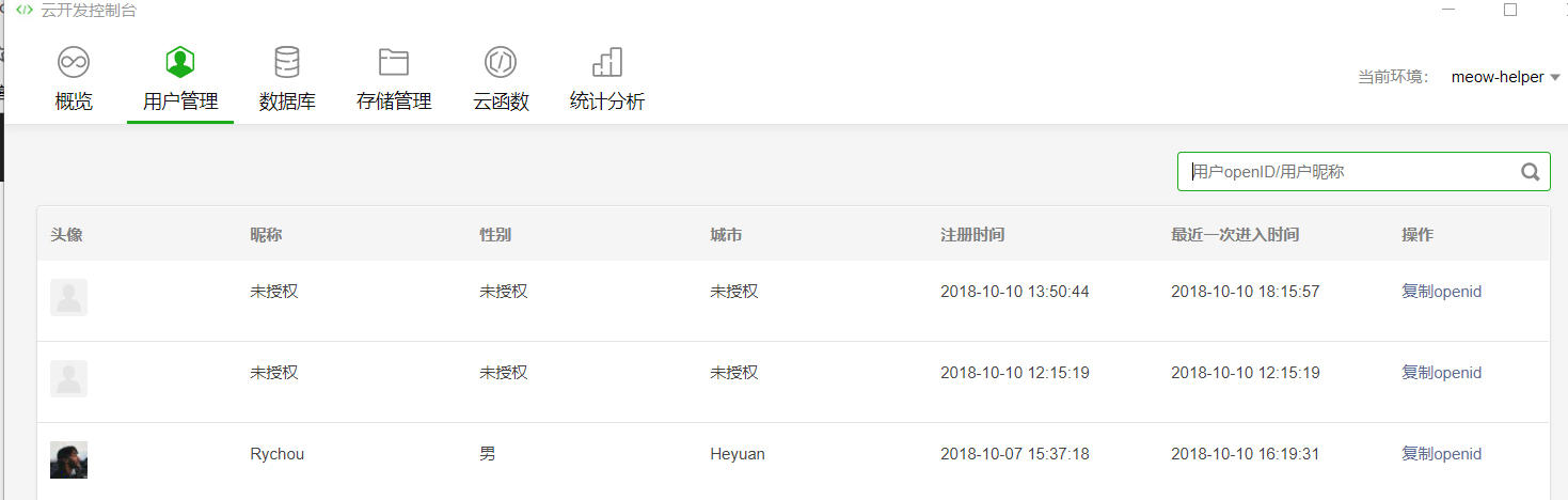 若用户授权了,那么你能在云开发控制台的用户管理中看到用户信息,否则只能看到一条记录以及openId