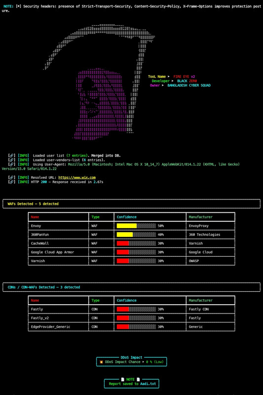 FIRE-EYE (fire-eye.py) is a Python3-based advanced security analysis framework that detects and fingerprints Web Application Firewalls (WAFs), CDNs, Load Balancers, and related security layers.