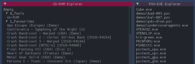 - PSX-EXE Explorer (file explorer for raw executables like tests, homebrew or demoscene demos)