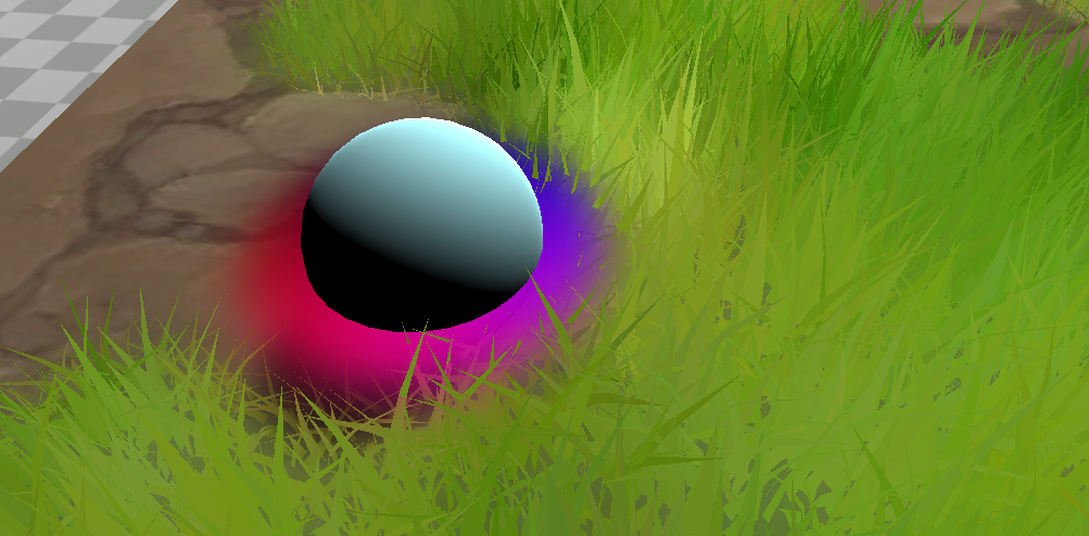 Every object that wants to support displacement needs a displacement texture and a DisplacementObject script on them. This script will influence the transparency of the displacement texture to have an effect on the strength of it's influence on the grass' displacement. This is showcased in the example scene.