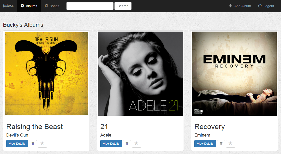 Once songs are added to an album you are then able to play, favorite, and delete them.