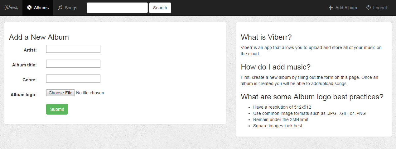After an album is created you will then be able to add/upload songs. Currently supported file types are WAV, MP3, and OGG.