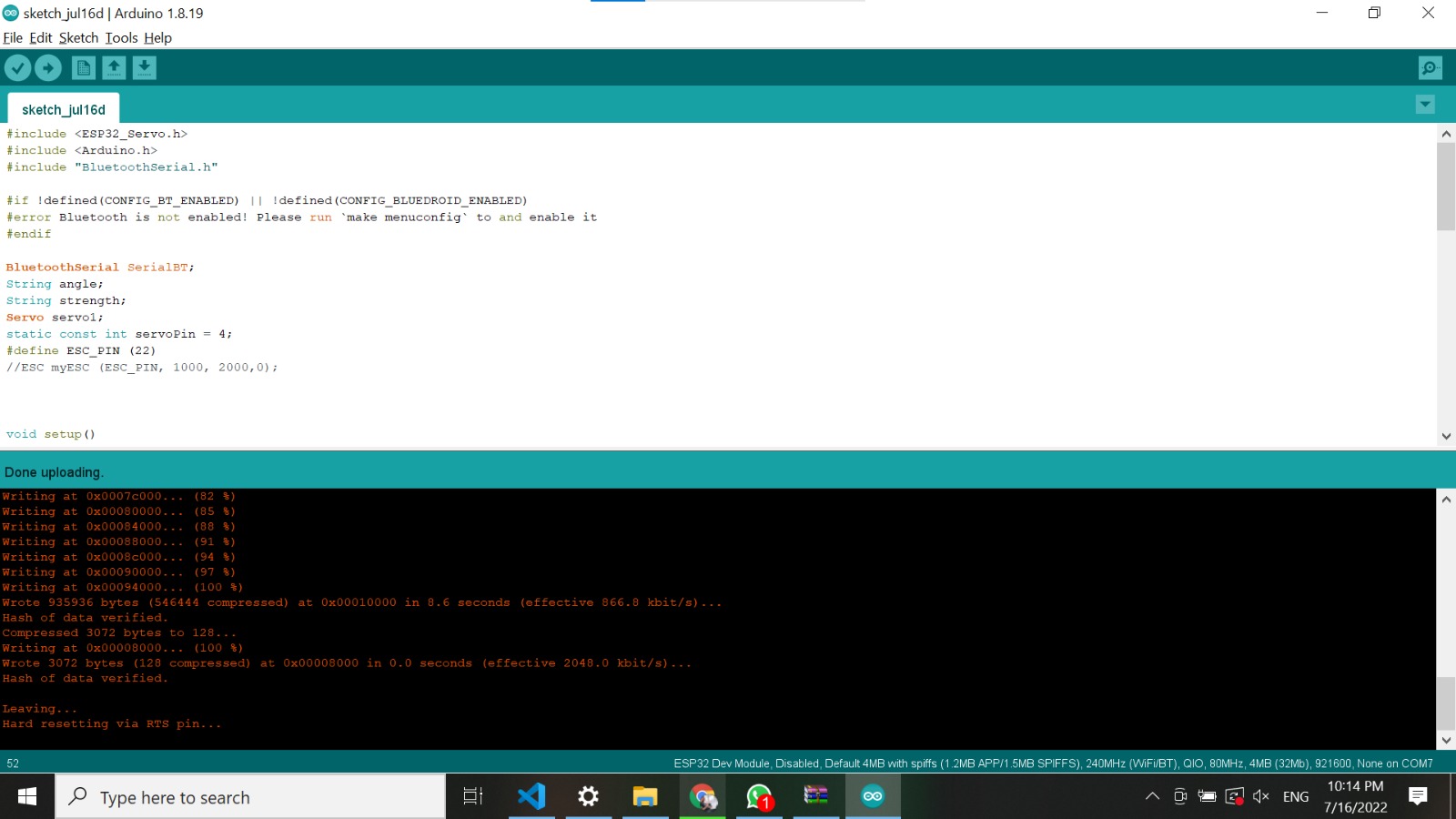 First of all you need to install the Arduino IDE to upload your code on ESP32 Board, what we did so far that we calibriated the ESP32 to recieve a Bluetooth Serial to and to parse it in order to navigate the vehicle lets check the code, this code is used to calibarte the ESP32 to navigate the vehicle PSB : We can see the first trial to when the RC car is not calibirated