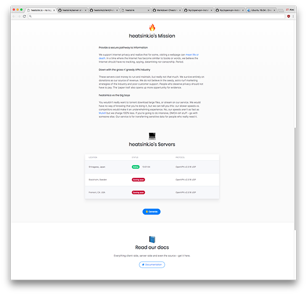 heatsink is a service that allows you to run a disposable VPN service. It utilizes two VPSes, one to host the openVPN server (+ nginx to serve cert's and profiles) and another VPS to host the app website. The user goes to your domain, clicks on "generate" and has a disposable VPN account created for a specific amount of time.