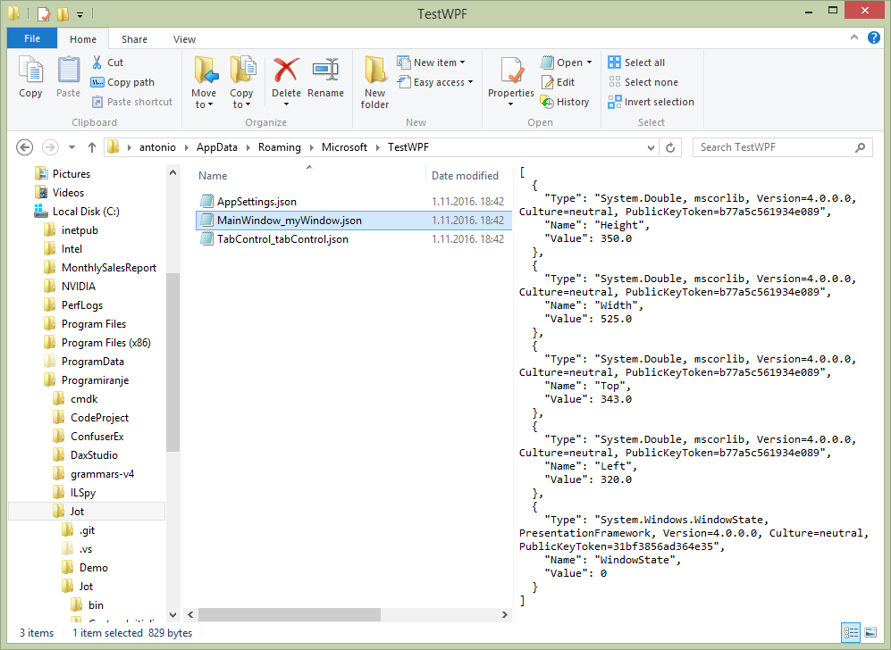 Tracker(IStore store)Jot comes with a built-in implementation of IStore called JsonFileStore. If the IStore argument is not provided, the data will be stored in json files in the following folder: %AppData%\[company name]\[application name]. The company name and application name are read from the entry assembly's attributes). For each target object, there will be a separate file. Data is stored in separate files in order to make reading and writing data fast.
