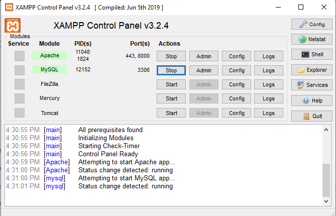 Once you have installed XAMPP, run the XAMPP Control panel and Start "Apache" and "MySQL" Modules as shown in below screenshot