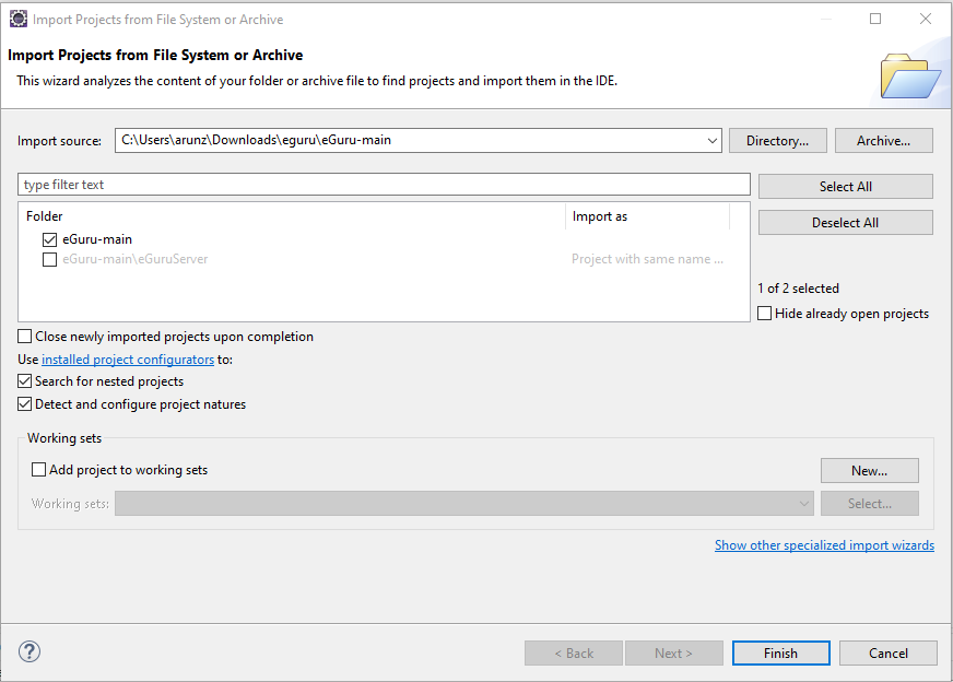 Now if you have the zipped code downloaded then please extract it to some folder. Then from Eclipse goto File > Open Projects from File System. And browse your extracted project folder as shown in the screenshot below.
