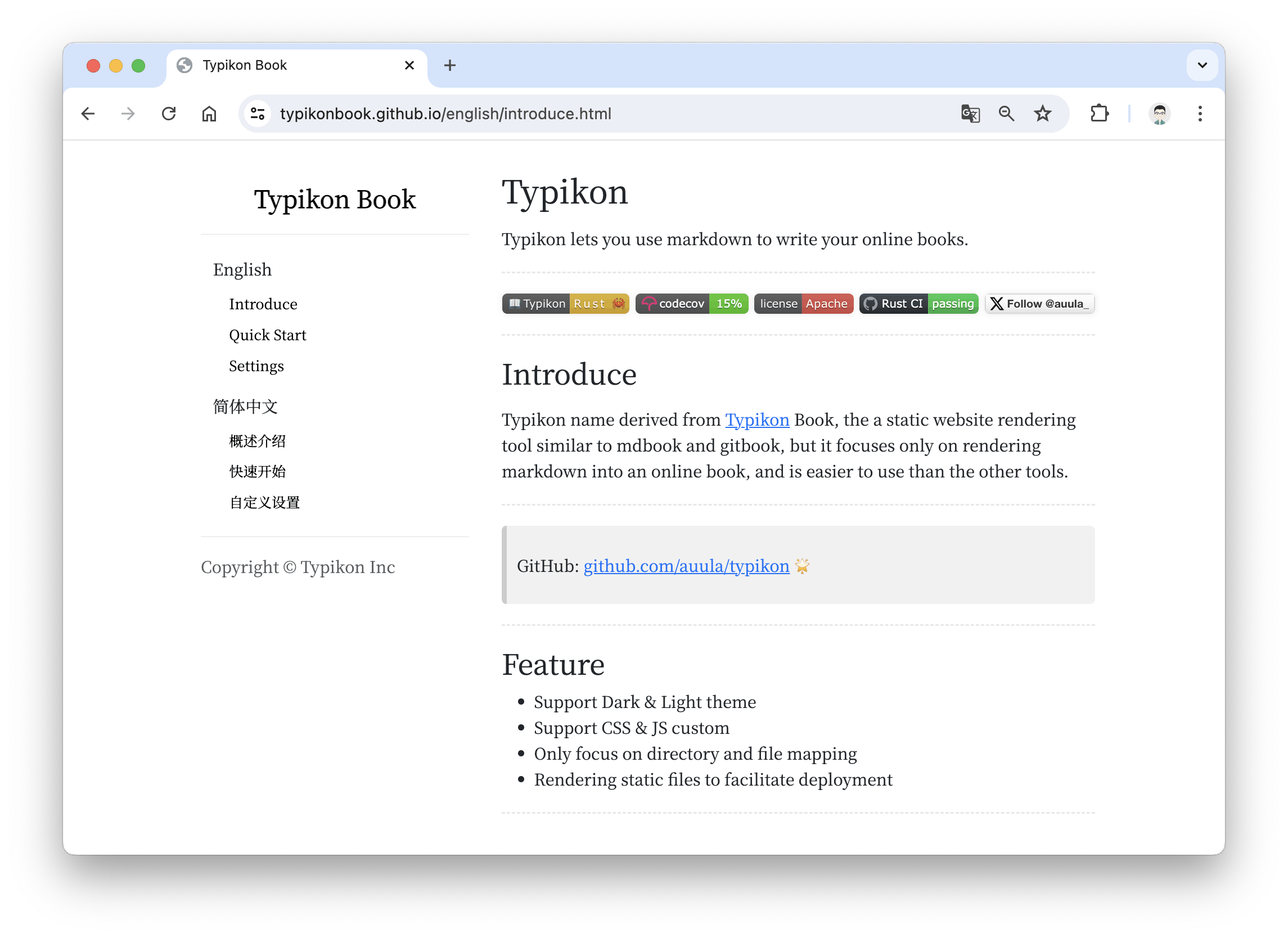 Typikon name derived from Typikon Book, the a static website rendering tool similar to mdbook and gitbook, but it focuses only on rendering markdown into an online book, and is easier to use than the other tools.