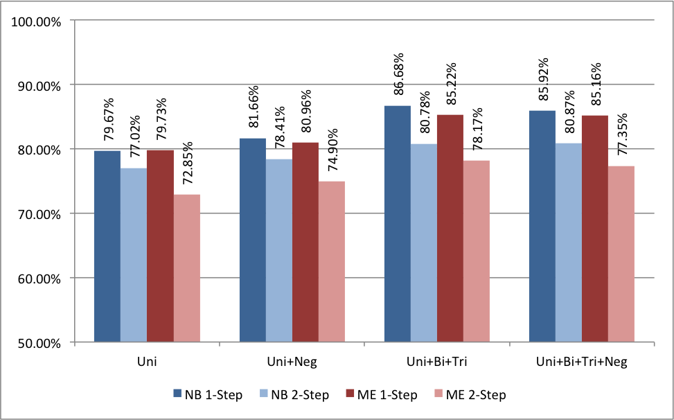 The results from training the Maximum Entropy Classifier are shown below in Figure 10 . Accuracies follow a similar trend as compared to Naive Bayes classifier. Unigram is the lowest at 79.73% and we see an increase for negation detection at 80.96%. The maximum is achieved with unigrams, bigrams and trigrams at 85.22% closely followed by n-grams and negation at 85.16%. Once again, the accuracies for double step classifiers are considerably lower.