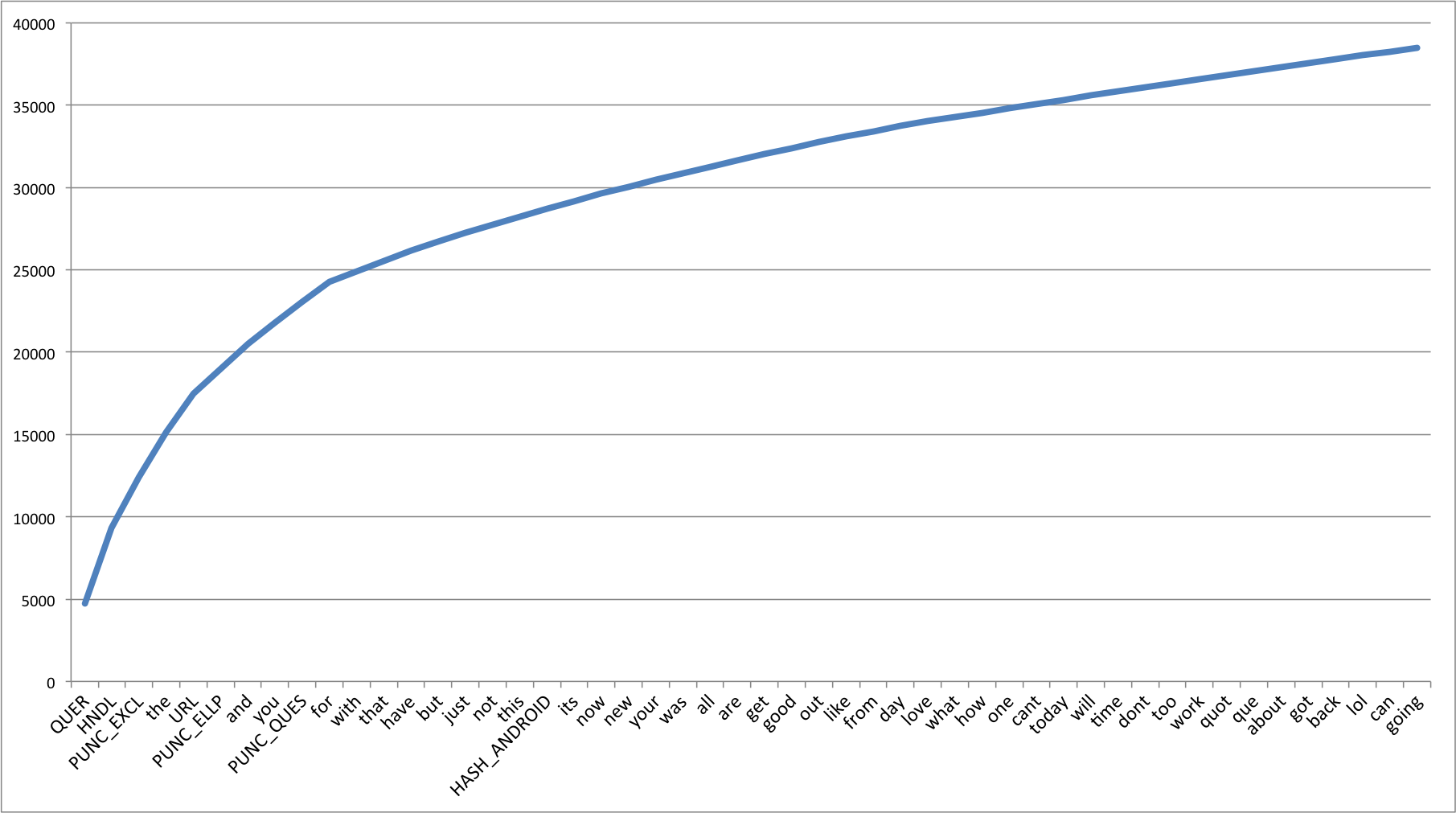 Unigrams are the simplest features that can be used for text classification. A Tweet can be represented by a multiset of words present in it. We, however, have used the presence of unigrams in a tweet as a feature set. Presence of a word is more important than how many times it is repeated. Pang et al. found that presence of unigrams yields better results than repetition [1]. This also helps us to avoid having to scale the data, which can considerably decrease training time [2]. Figure 3 illustrated the cumulative distribution of words in our dataset.