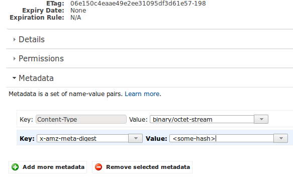 Adding ability to add x-amz-meta-* headers here would seemingly allow us to upload custom metadata fields with our backup, like so: