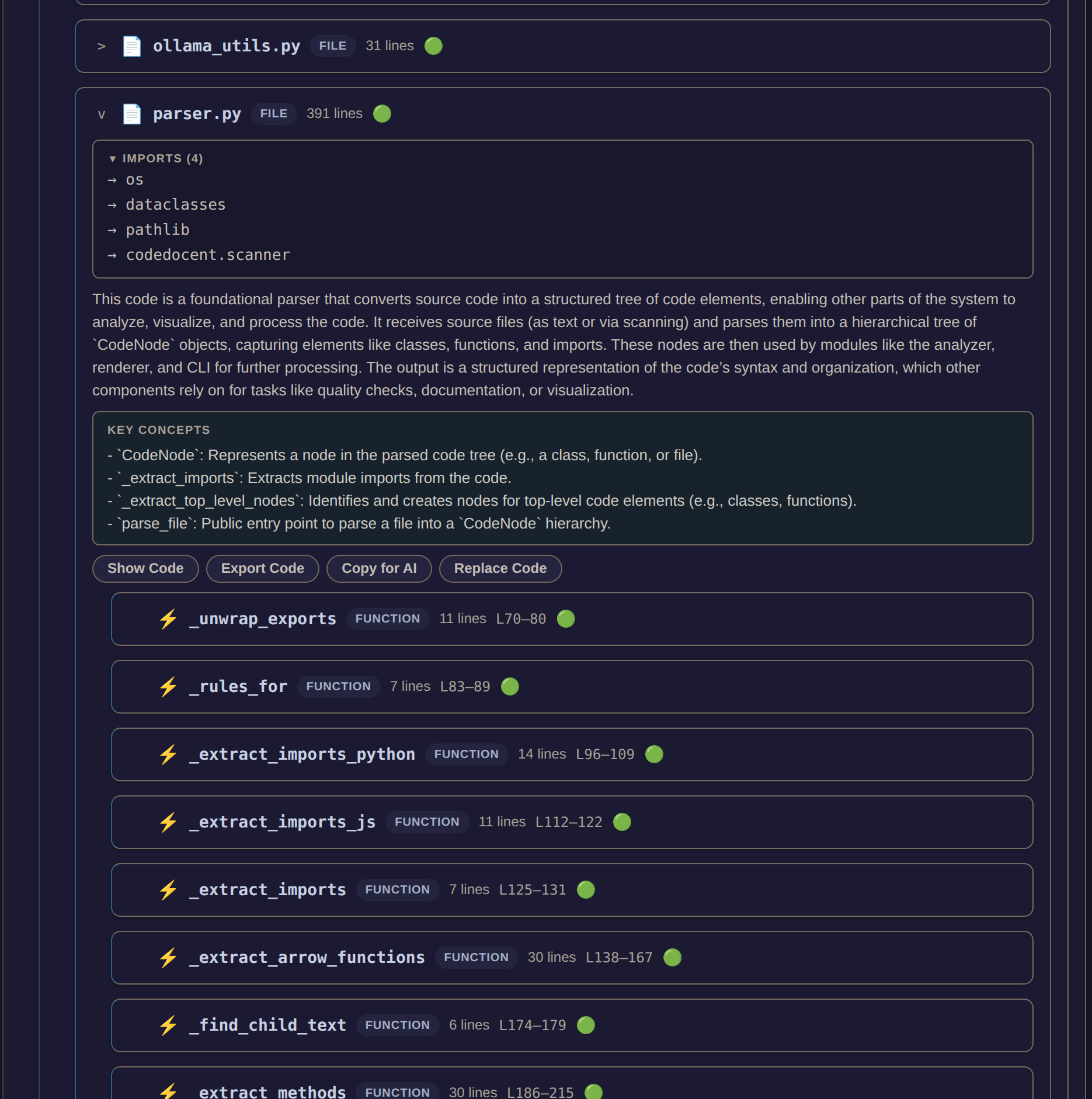 Codedocent parses the codebase into a navigable, visual block structure and explains each piece in plain English. It's an AI code analysis tool — use a cloud provider for speed or run locally through Ollama for full privacy. Point it at any codebase and get a structural overview you can explore interactively, understand quickly, and share as a static HTML file.