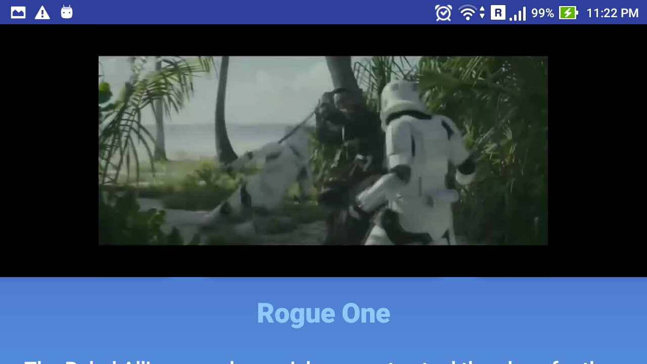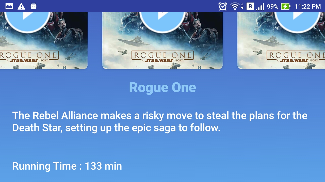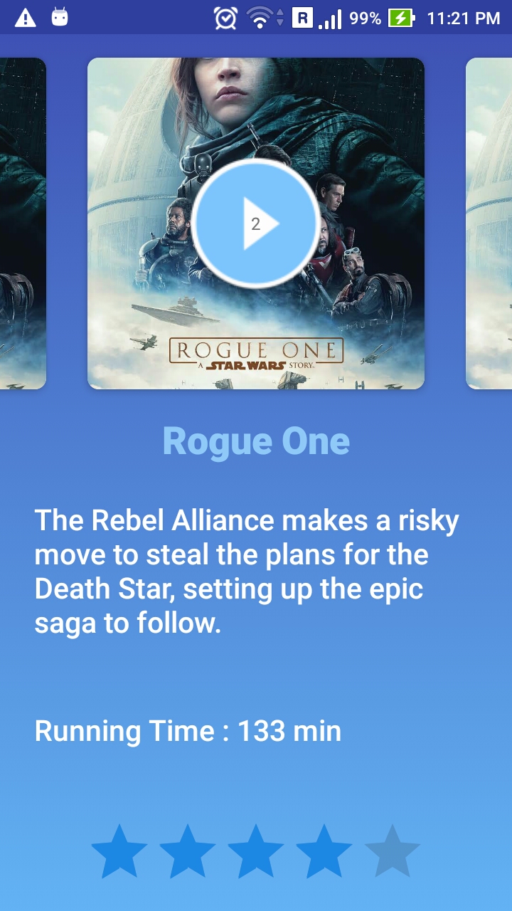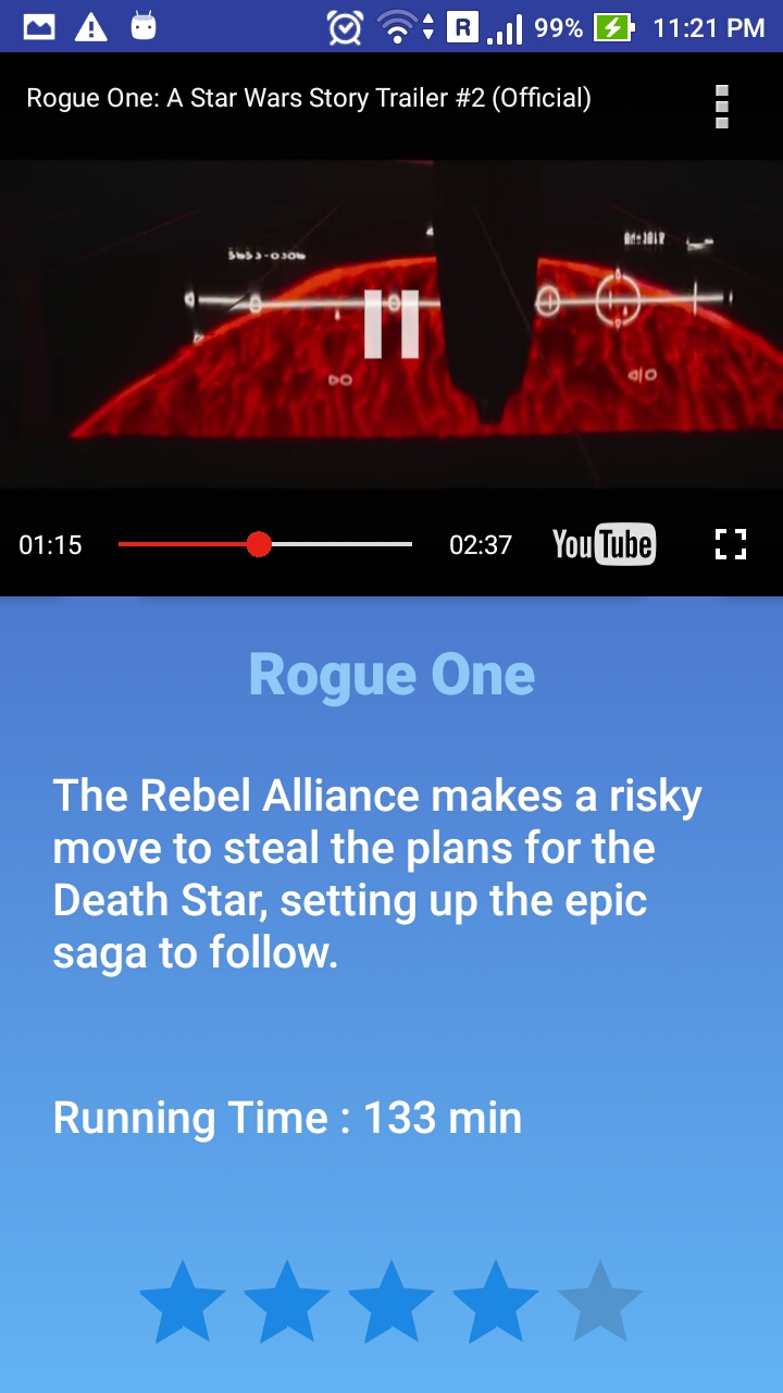 - Click on a Card to open new activity which shows detail information about that particular movie. The top section consists of a RecyclerView which shows all the movie trailers associated with that movie(Number of trailers are different for each movie)