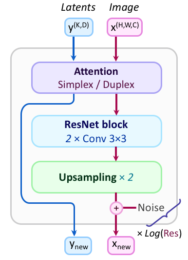 --style) to theklatent components, such that first the global latent modulates all the image features uniformly, and then theklatents modulate different regions based on the bipartite transformer's attention.