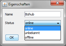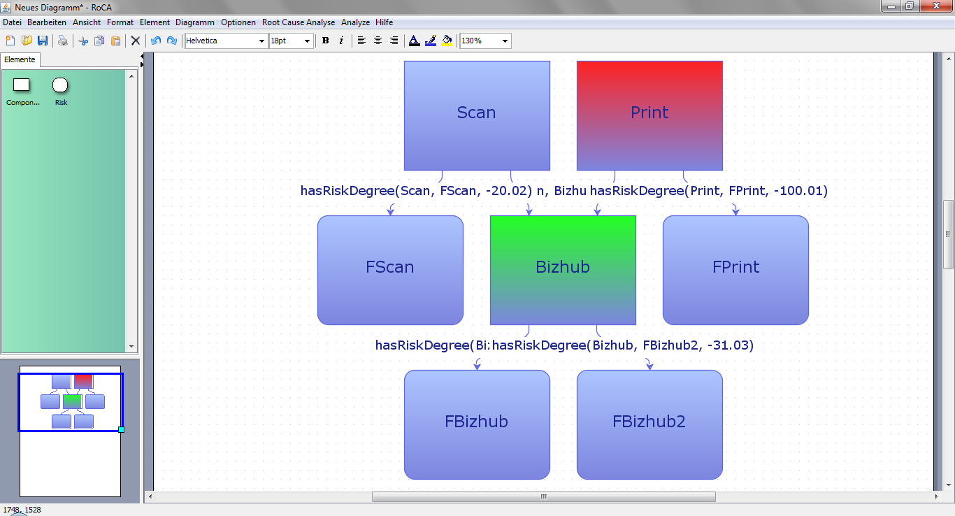 You can edit the model by either drag&drop of new elements from the palette on the left side, or draw new edges between already placed components. RoCA automatically determines the type of an edge (dependsOn between components, hasRiskDegree between a components and risks). By double-clicking on a component or an edge you can edit its properties: name and state for componentes, and weight for relations.