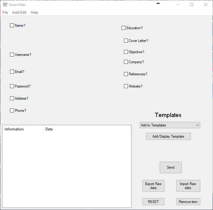 This is a form filler program that I wrote. Rather than read the tags of HTML forms and inputing information that way, this form filler allows the user to select information that they have stored in the form filler and, when the user clicks in an input box and the mouse cursor is displaying as the "carret", will automatically write the information curretly selected in form filler, which allows it to work on any file, document, or form which you would need to fill. The executable (passw.exe) contains a help file which can be accessed by pressing "F1" when the GUI appears and is the only file needed for the script to function.