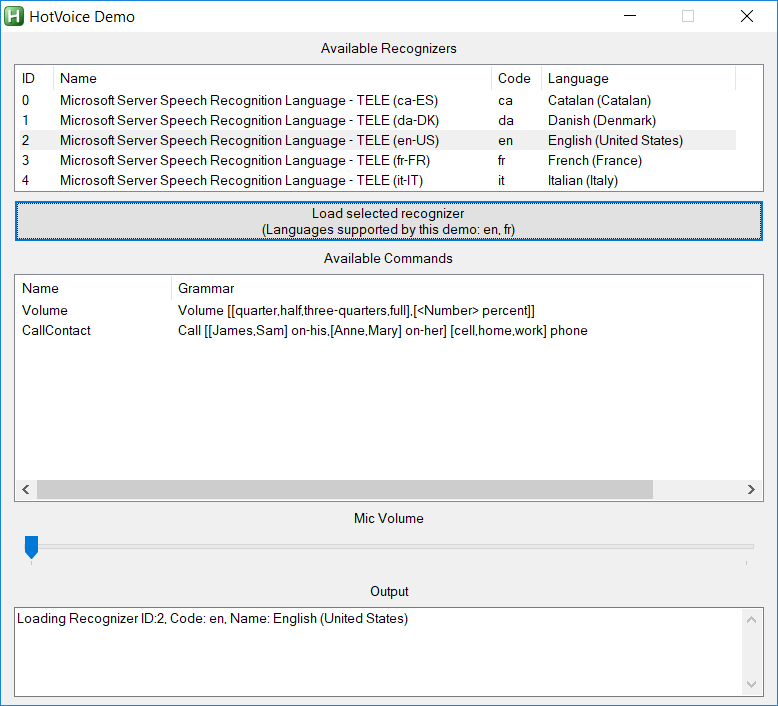 "Recognizers" are basically Language Packs. Ordering seems to be based on installation order, with the "Lightweight" pack always present and at the end of the list. Therefore, if you only install one language pack, it should always be ID 0, so everything in HotVoice defaults to using ID 0. The Mic Volume slider should move when you speak.