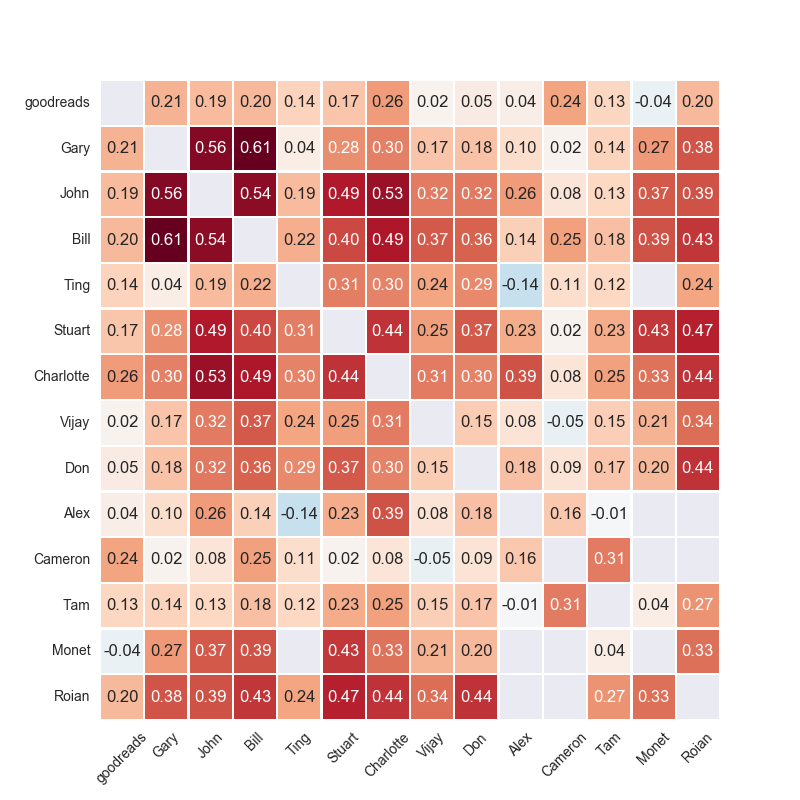 regularized estimate of correlations between pairs of reviewers (10 observations minimum)