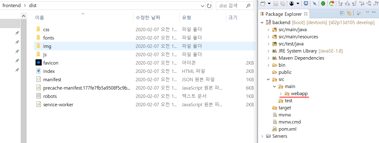 - src/main/ 아래에 webapp 폴더 생성 후 dist파일 안 내용 전부 넣기 (아래 사진처럼)