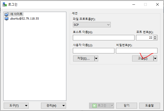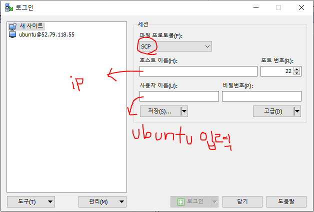 - SCP 프로토콜 선택, 호스트 ip입력, 사용자이름에 ubuntu 입력