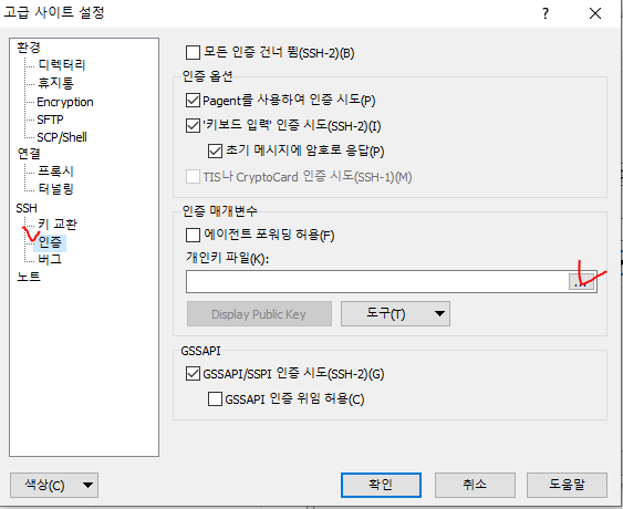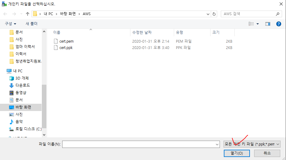 인증, 파일 선택 클릭(.pem 파일 넣어야함)