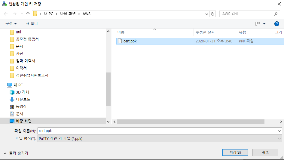 .pem 파일을 .ppk로 바꾸어 줌 → 확인 클릭