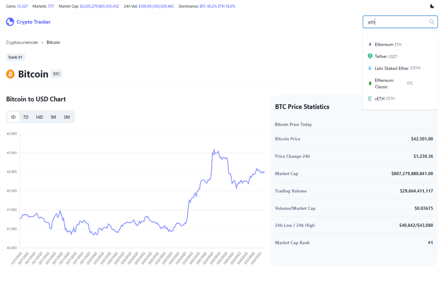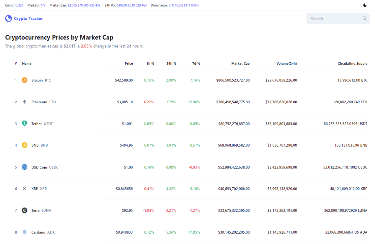 A Crypto Tracker project built with React, Redux, Chakra UI and CryptoApi. Get the cryptocurrency information with smart layout and pagination. Search through thousands of cryptocurrencies with autocomplete. View price, price chart, price change, market rank, market cap, trading volume and more.