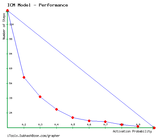The process runs in discrete steps. At the beginning of ICM process, few nodes are given the information known as seed nodes as in our case we have started with one active node. Upon receiving the information these nodes become active. In each discrete step, an active node tries to influence one of its inactive neighbors. In spite of its success, the same node will never get another chance to activate the same inactive neighbor. The success depends on the propagation probability of their tie. Propagation Probability of a tie is the probability by which one can influence the other node. In reality, Propagation Probability is relation dependent, i.e., each edge will have different value. However, for the experimental purpose, it is often considered to be same for all ties.