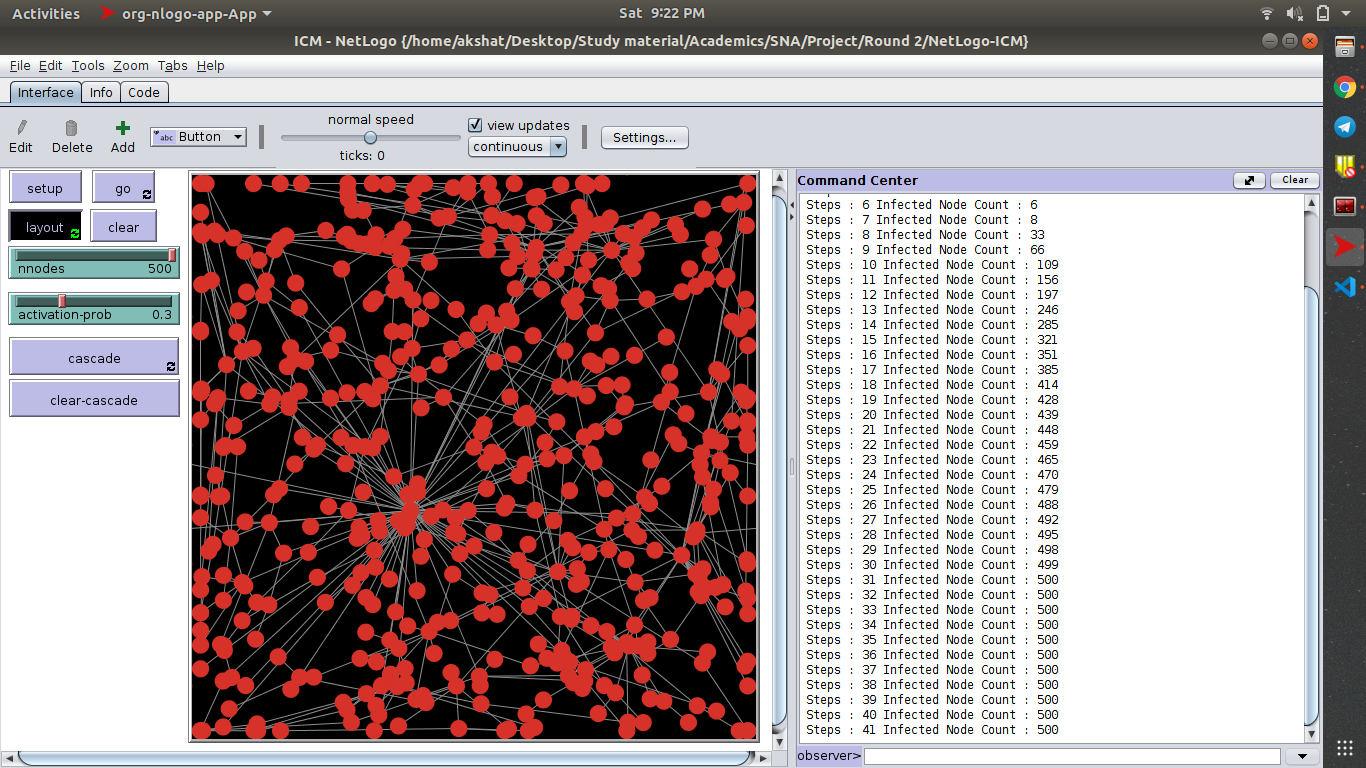 - The size of network is taken to be 500 nodes ( Because of hardware restrictions with NetLogo client over PC and ease of analysis )