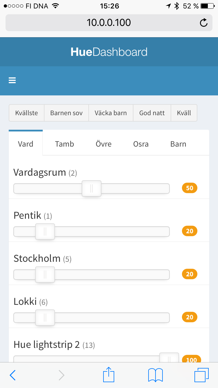 The buttons at the top are for activating scenes (such as "the kids have gone to bed") and the tabs are rooms. "Vardagsrum" = living room. The topmost slider in every room affects all lights in the room. A yellow light in a tab means all lights are on. A blue (or teal or whatever) light means some lights are on.