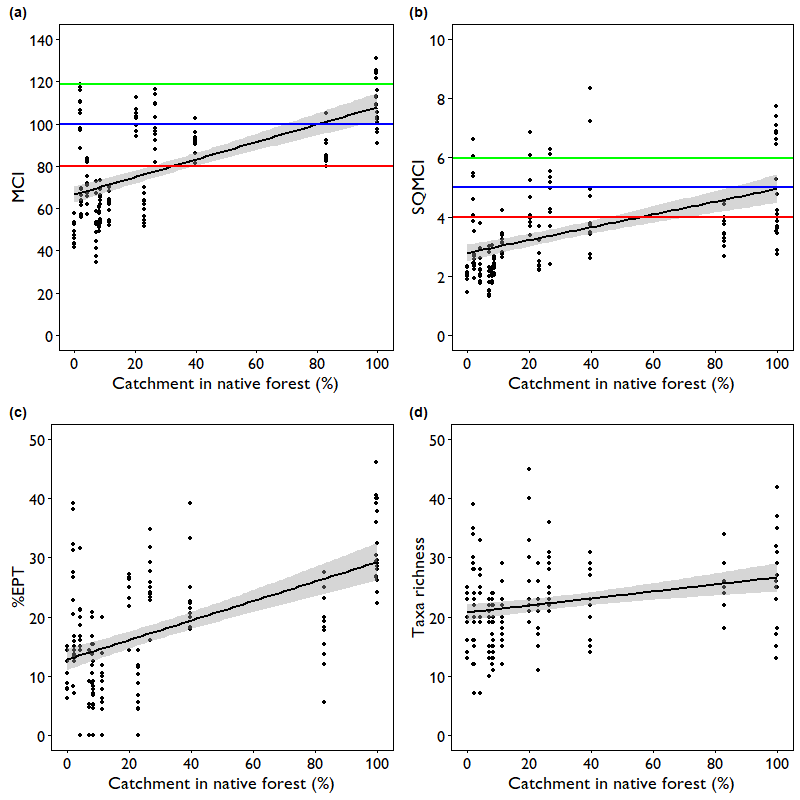 sites.rprints a mp with all studied sites.stats.rprovides results from all linear regression, Pearson and Kendall correlation tests.mds.rprovides non-parametric multidimensional analysis on macroinvertebrates community composition.streams.rprovides with a wide variety of plots for the MCI, SQMCI, %EPT and Taxa richness for individual sites and main land use categories Native, Forestry, Urban and Pasture lands.