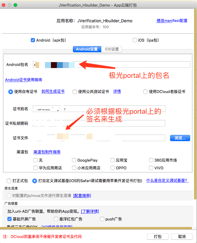 c、HbuilderX 中制作打包自定义基座。注意:包名,签名,证书,bundleID 需要与对应 appkey 配置的应用信息保持一致。(极光 portal注册分配)