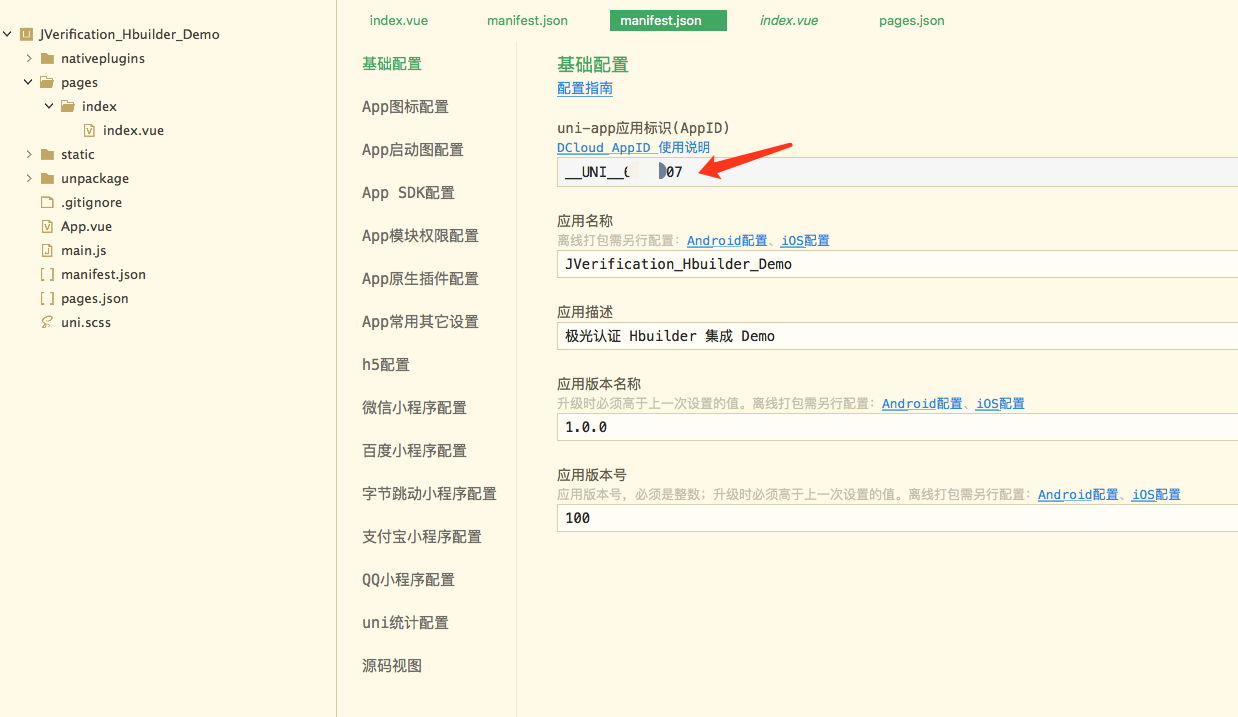 a、可以去GitHub上下载demo,用HbuilderX打开JVerification_Hbuilder_Demo文件,在manifest.json文件里面自己生成一个uniapp的appid,这是自动生成的。有的话换成自己的appid。