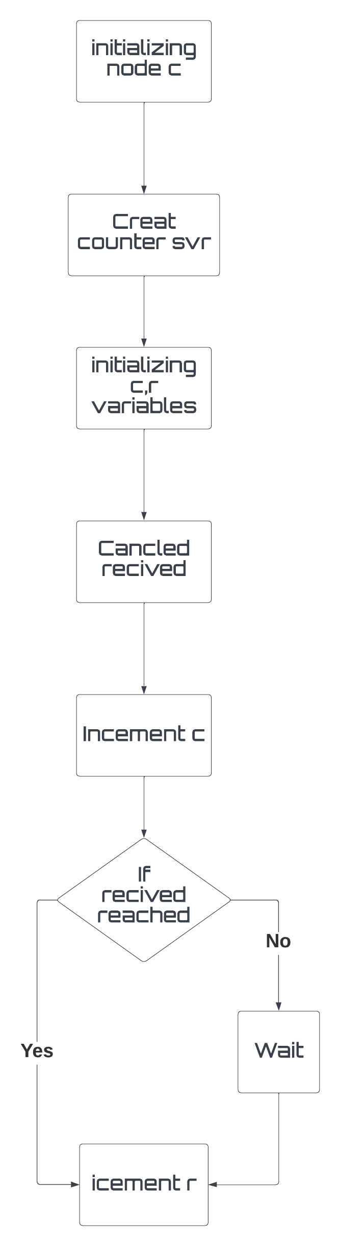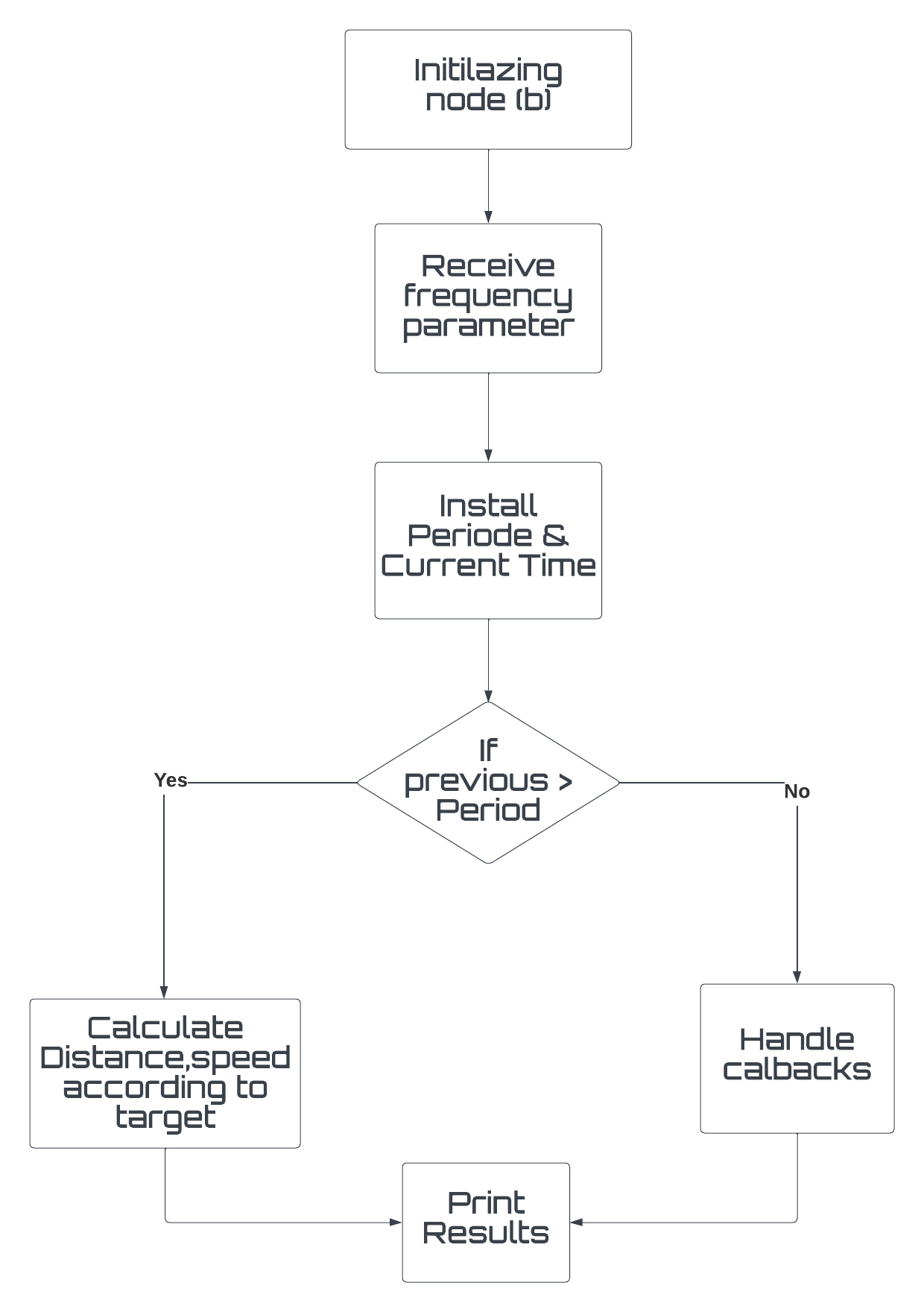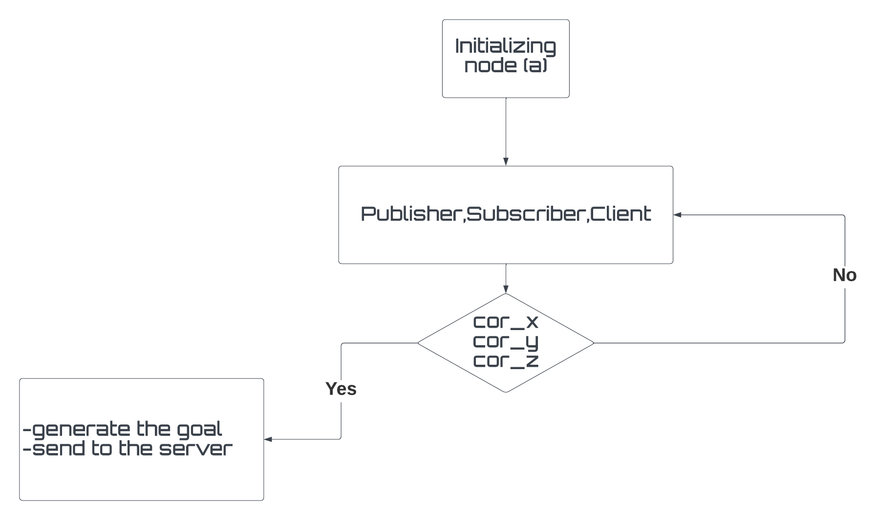 The flowchart of the program shows the sequence of actions taken by the nodes. Node (a) retrieves user input and sets a goal, which is then passed to node (b) to calculate the average speed and distance. Node (c) counts the number of goals reached and canceled.