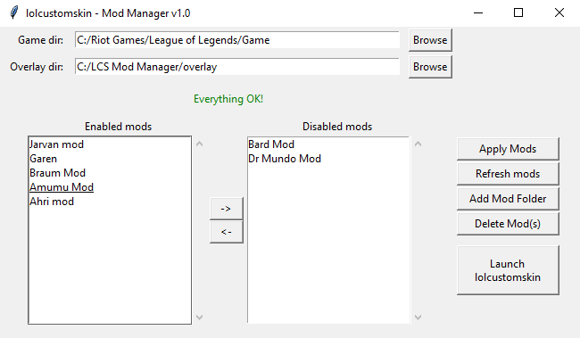 LCS Mod Manager GUI Mod Manager for lolcustomskin Made in collaboration with @moonshadow565 Please see the Wiki on how to use this program.